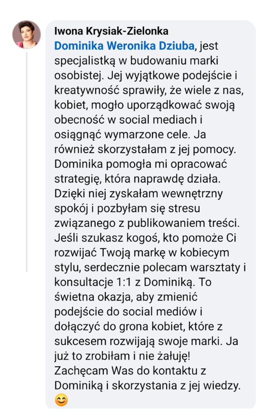 - Przez 5 lat prowadziłam social media moich klientów — prezesów firm, dyrektorów, przedsiębiorców i ekspertów.Widziałam na żywo, co działa, co nie działa i dlaczego niektóre marki rosną, a inne stoją w miejscu mimo ogromnego potencjału. To była praktyka, która dziś procentuje.